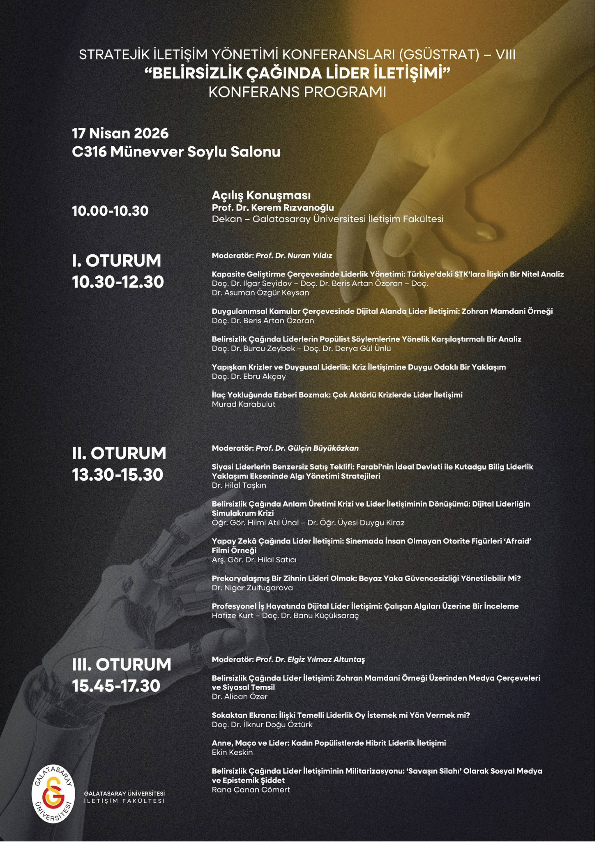Farklı disiplinlerden beslenen sunumlar aracılığıyla, liderlik iletişiminin değişen doğası çok boyutlu bir perspektifle tartışmaya açılacak; dijital çağın getirdiği yeni fırsatlar ve kırılmalar kapsamlı biçimde değerlendirilecektir.